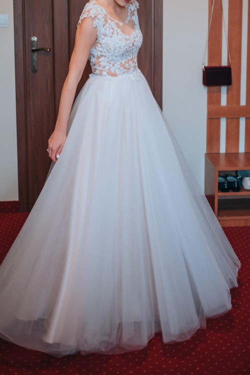 Góra sukni składa się z naszywanej ręcznie koronki. Koronka jest naszyta na cielistym tiulu. Suknia zapinana jest z boku na kryty zamek.