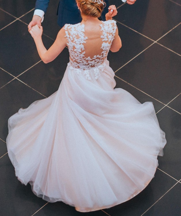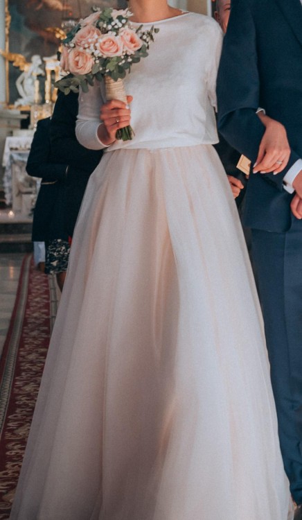 Dół sukni składa się z 3 warstw tiulu w kolorze śmietankowym oraz jedwabnej podszewki w kolorze łososiowo-różowym, która delikatnie prześwituje przez warstwy tiulu.