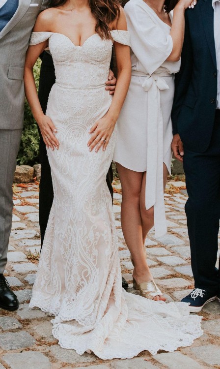 Suknia jest koronkowa, koronka bogato zdobiona perełkami i kryształkami układa się w symetryczne wzory. W talii perełkowy pasek. Góra jest oparta na gorsecie z wewnętrznym sznurowaniem (widoczne na jednym ze zdjęć). Posiada przepięknie układający się tren. Pięknie podkreśla figurę, talię i biust.