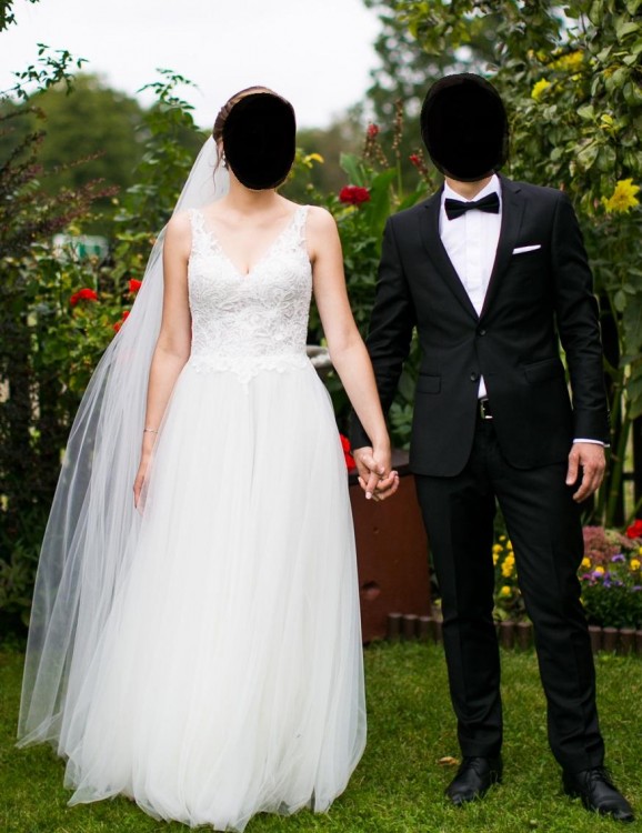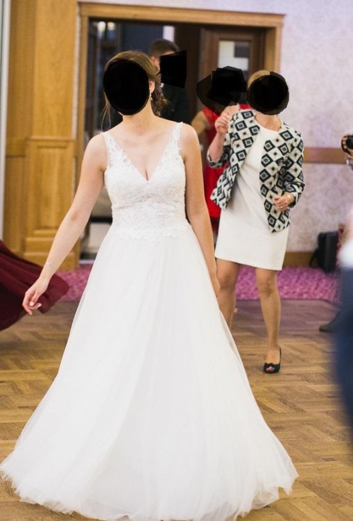 Sprzedam suknię ślubną model Laurita z kolekcji Annais Bridal by Ola La 2018. Suknia w kształcie litery A. Rozmiar 38 na wzrost 172+1,5 cm. Kolor sukni Ivory. Góra sukni delikatna koronka na siateczce w kolorze sukni, dół kilka warstw tiulu. Dekolt w literę V, tył również litera V. Suknia lekka, zwiewna, delikatna. Do sukni gratis welon tiulowy do ziemi w kolorze sukni. Stan sukni bardzo dobry. Zapraszam. Możliwość zmierzenia w Białymstoku lub okolicach Zambrowa.