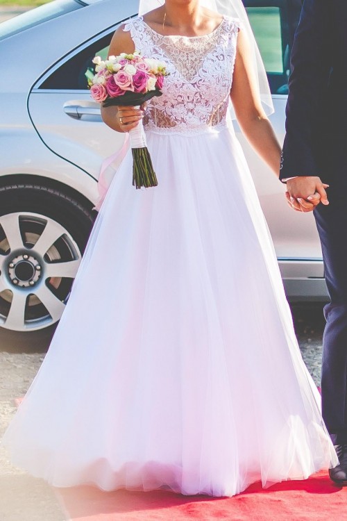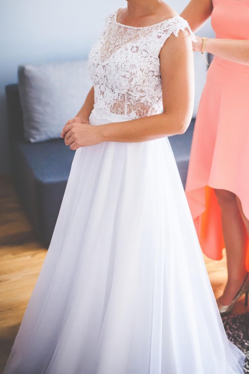 Góra sukni jest miękka, zabudowana koronką, widać delikatnie prześwity skóry, dodaje to uroku i lekkości. Dekolt w kształcie łódki.
