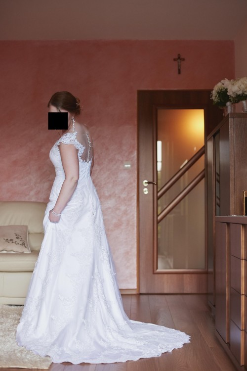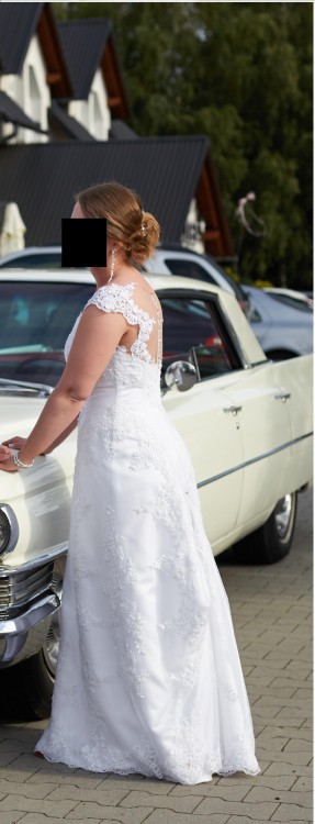 Z tył wycięcie na plecach zapinane na przeźroczyste guziki. Sukienka bardzo lekka jak na suknie ślubną. Sprzedaje w komplecie z welonem długim z haftem za obrzeżach.