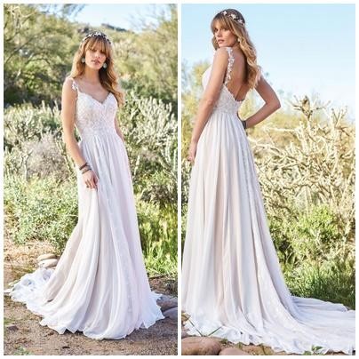 Jest to muślinowa suknia o kroju litery A. Dół sukni jest zwiewny i ozdobiony pionowymi wstawkami delikatnej koronki na przodzie oraz na tyle sukni. Koronkowa góra jest wykończona z tyłu guzikami przy zamknięciu na suwak. Ozdobą górnej części sukni są koronkowe ramiączka. Suknia posiada podpinany tren.