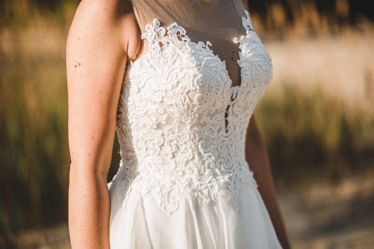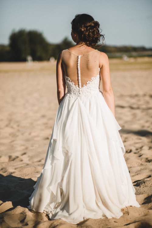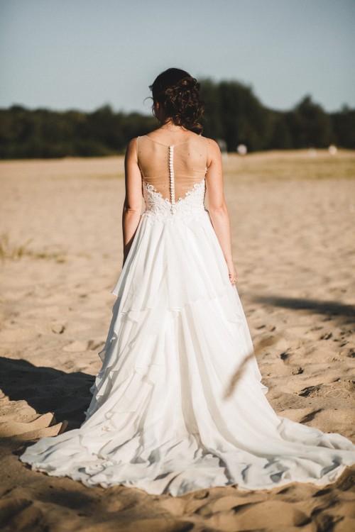 Niepowtarzalna suknia ze spódnicą z nieregularnych, szyfonowych warstw; połyskujący, koronkowy gorset z iluzorycznym dekoltem w łódkę. Na górze cielista siateczka, która sprawia, że noszenie tej sukni jest bardzo komfortowe. W gorset wszyte są wkładki typu push-up. Na dole przepiękny muślinowy tren, bardzo łatwo się podpina i pięknie wpasowuję w resztę nieregularnych warstw spódnicy. Suknia bardzo wygodna.