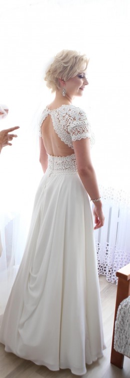 Suknia z krótkimi rękawkami ze spódnica z jedwabiu i szyfonu z wycięciem na plecach.