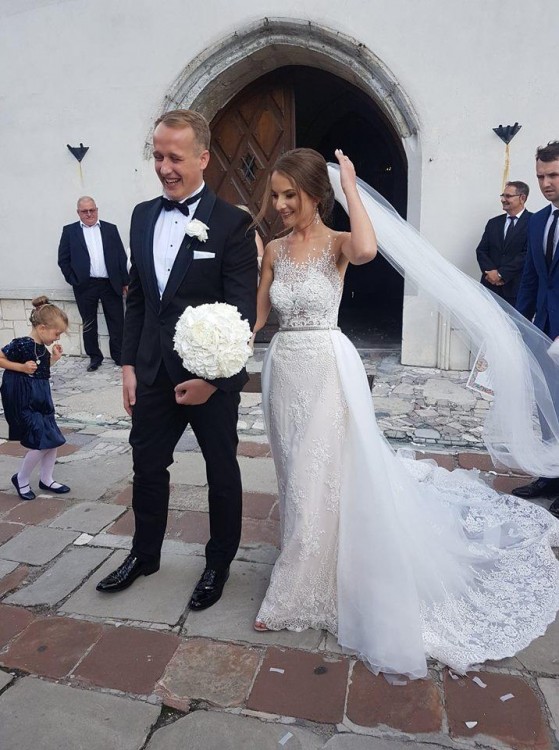 Suknia ślubna z doczepianym trenem marki Milla Nova model Lina+jedwabny welon katedralny rozmiar 34