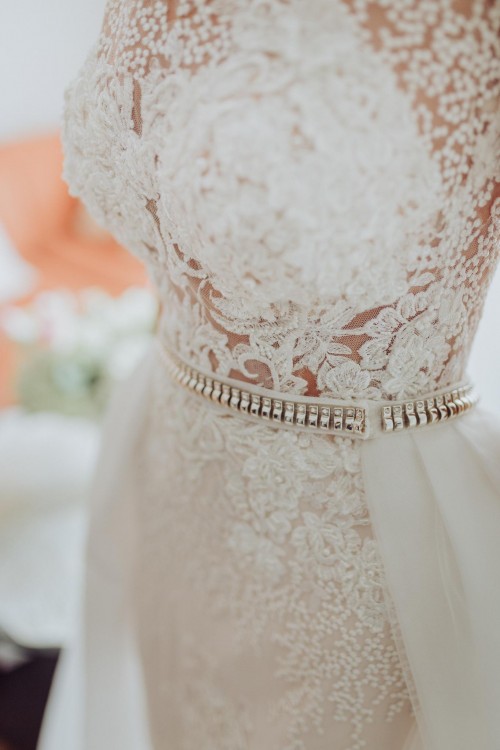 W sukni oryginalnie wszyte są miseczki, na moje życzenie dodatkowo doszyto miseczki 75A (można je usunąć lub doszyć inne) Całość trenu na dole wykończona koronką taką samą jak w sukni.