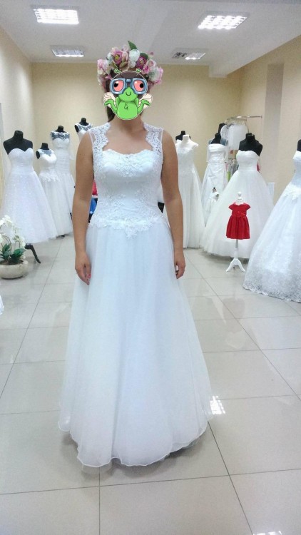 Suknia w kształcie litery A. Posiada wiązany gorset, który idealnie dopasowuje się do figury. Wyszyty drobnymi koralikami, które mienią się w świetle.