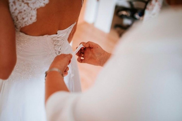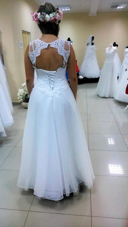 Biała suknia w kształcie litery A z wiązanym gorsetem. Możliwość zmierzenia w Krakowie. Zapraszam