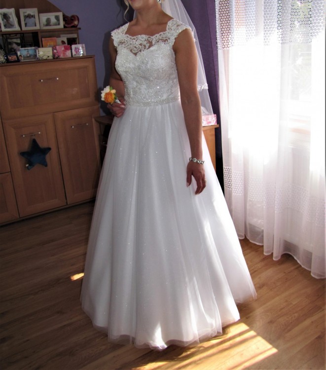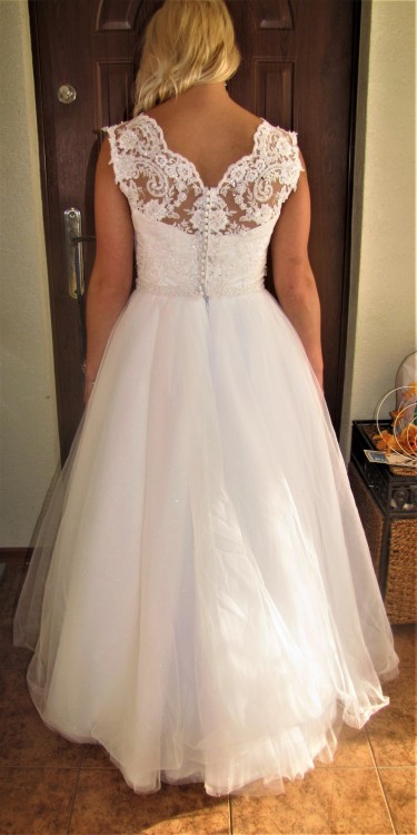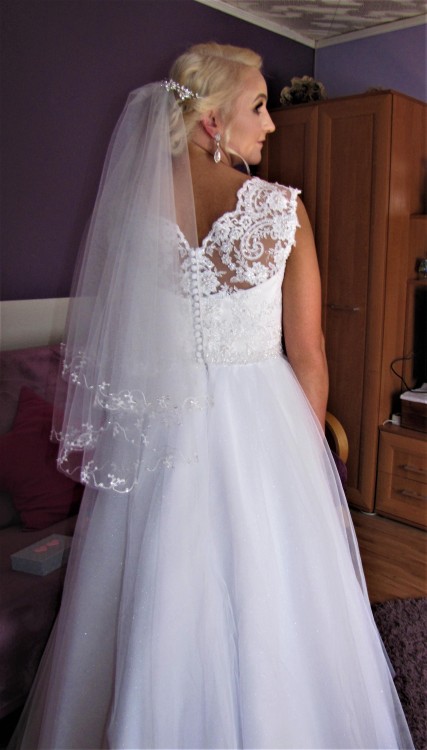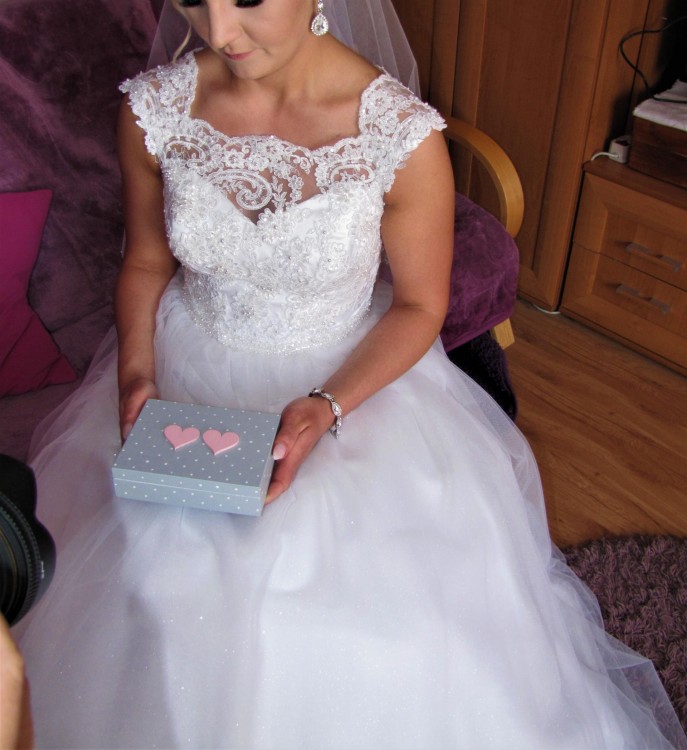 Suknia zdobiona kamieniami, z tyłu dodatkowo guziczki. Wewnętrzna warstwa tiulu pokryta jest brokatem - pięknie się mieni. Jestem pierwszą właścicielką sukni, została ubrana tylko na ślub oraz sesję ślubną. Suknia wyczyszczona chemicznie. Kolor śnieżna biel.