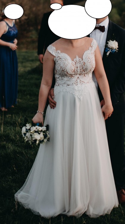 Śliczna suknia ślubna w kolorze złamanej bieli, góra sukni z oryginalnej koronki naszytej na siateczce, dół z lekkiego tiulu.