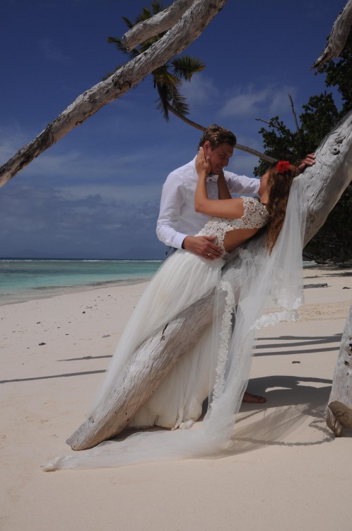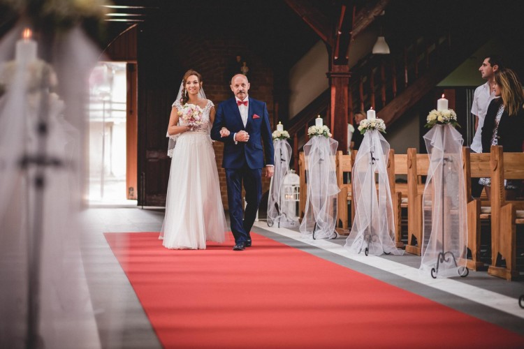 Górna część sukni w całości pokryta jest koronką, która lekko się mieni w słońcu. Suknia posiada wycięcie na plecach w kształcie litery O. Zapinana w dolnej części z tyłu na zamek – aby nie był widoczny przykrywa go tiul. Górna część tylna zapinana jest małymi ozdobnymi guziczkami. Suknia posiada przepiękny 2-metrowy welon, który jest wykończony dookoła koronką, pokrytą drobnymi cekinkami jak w gorsecie. Tiul jest tak delikatny, aby nie zasłaniał sukni. Dodaje jej nowego uroku.
