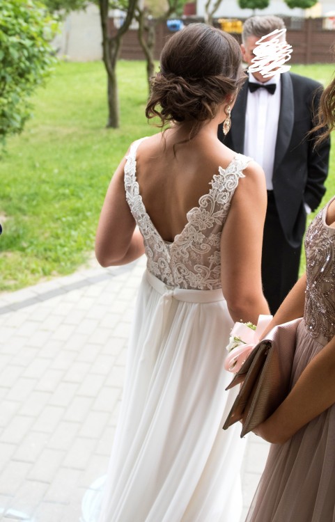 Sprzedam suknię ślubną zakupioną w 2017r. w salonie w Katowicach, pochodzącą od marki Love for Love - model „GLORIA”. Suknia jest koloru śmietankowego/złamanej bieli, góra wykonana z przepięknej koronki, dół zwiewny muślinowy przepięknie układający się w tańcu. Miseczki wbudowane. Dodatkowo zostały wszyte „sprytne szlufki”, dzięki którym można ukryć ewentualne zapięcie od biustonosza. Tył wycięty, jednak nieco skrócony niż w pierwotnej wersji. Do sukni dołączony jest oryginalny pokrowiec.