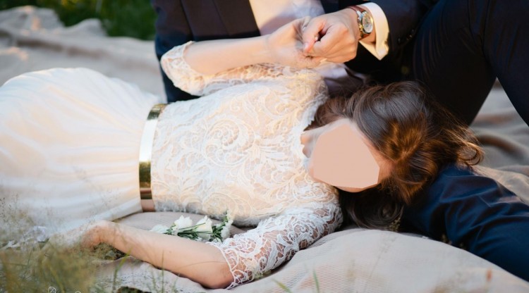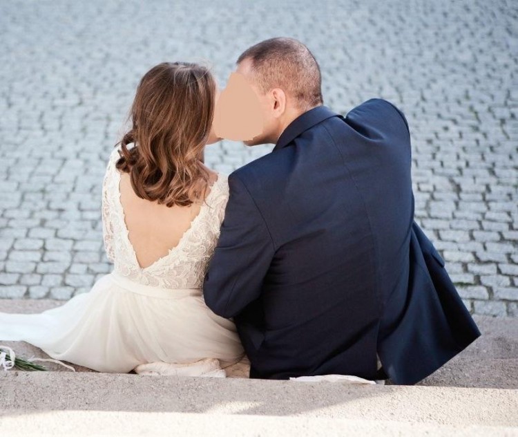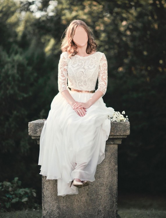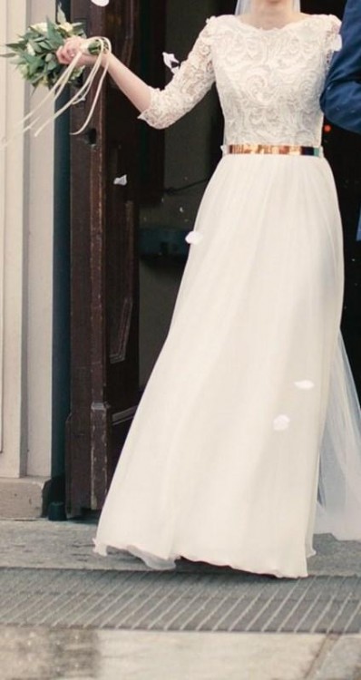 Dół sukienki wykonany jest według projektu Nikolla (bez rozcięcia) natomiast góra sukni według projektu Mabell. Góra wykonana z pięknej hiszpańskiej koronki, rękaw 3/4, a tył w kształcie litery V.