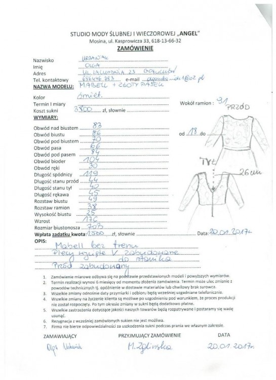 Sprzedam moją suknię ślubną model Mabell z kolekcji projektantki Violi Piekut. Rozmiar 36/38 + obcas ok 6cm (szczegółowe wymiary w postaci karty z przymiarki załączam poniżej). Suknia w kolorze śmietankowej bieli łączy w sobie zarówno ekstrawaganckie, jak i tradycyjne elementy. Przedłużeniem koronkowej góry sukni jest taka sama krótka spódnica. Szczególnie atrakcyjnymi rozwiązaniami są: średniogłęboki dekolt na plecach (zauważalny element, jednak niecałkowite odkrycie pleców zapewnia komfort,wycięcie umożliwia założenie wygodnego stanika,który nie spadnie;) oraz efektowne rozcięcie tiulowej spódnicy (widoczne na jednym ze zdjęć). Do sukni dołączam złoty pasek, idealnie podkreślający talię (świetnie wygladać będzie ze złotymi szpilkami). Suknia jest lekka i zwiewna, dzięki czemu swobodnie bawiłam się na własnym ślubie - polecam! Suknia sprawdzi się w ciepły wiosenny dzień, jak i podczas zimy - dobrze wygląda z płaszczykiem czy z futerkiem.