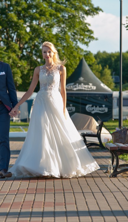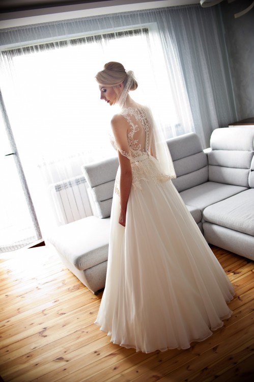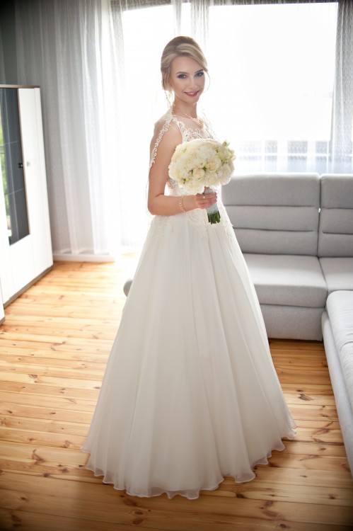 Suknia ma prześwitujący tył (siateczka), wykończony cudowną koronką (gipura), układa się wspaniale zarówno z kołem jak i bez (koło w cenie sukni ślubnej), świetnie prezentuje się w tańcu, jest lekka i wygodna, wzbudza zachwyt gości. Suknia ma wszyte dodatkowe miseczki stabilizujące biust. Zachęcam do kontaktu, suknię można mierzyć w okolicach Wrocławia.