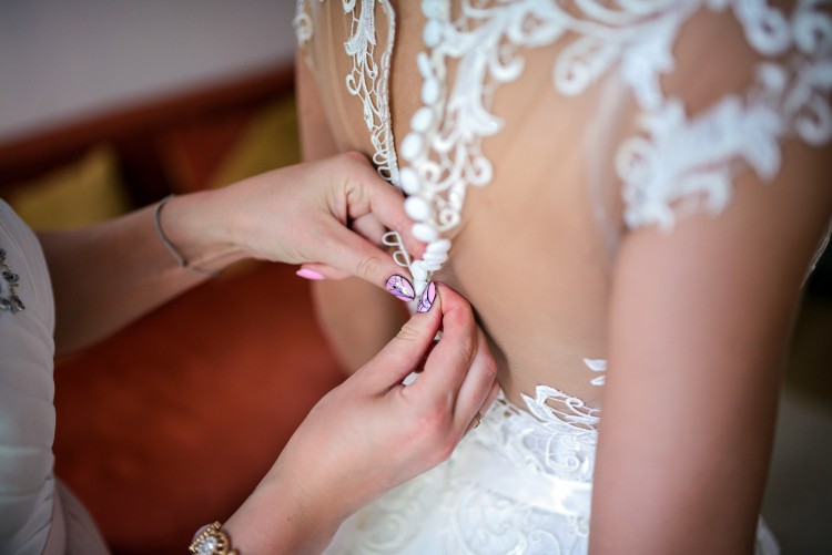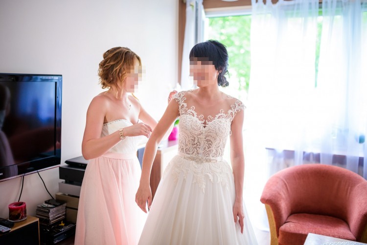 Góra sukni gorsetowa, wyszywana ręcznie gipiurą z cekinami. Tył zapinany na guziczki, gipiura układa się w kształcie serca.