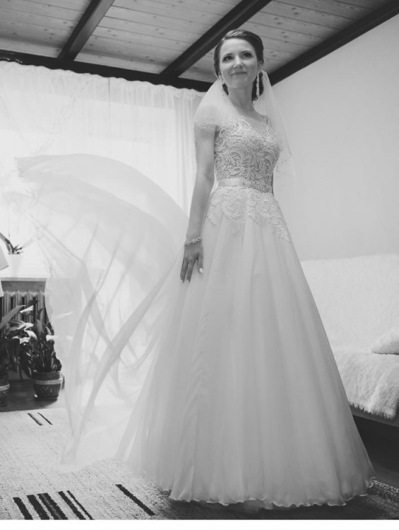Góra sukni wykonana jest z gipiury na cielistej, niewidocznej siatce.Dół sukni wykonany jest z kilku warstw lekkiego muślinu. Suknia posiada podpinany tren oraz biały pasek ozdobiony kryształkami. Kolor sukni- biały, kształt litery A. Suknia w doskonałym stanie, po praniu. Do sukni dołączam halkę z małym kołem.