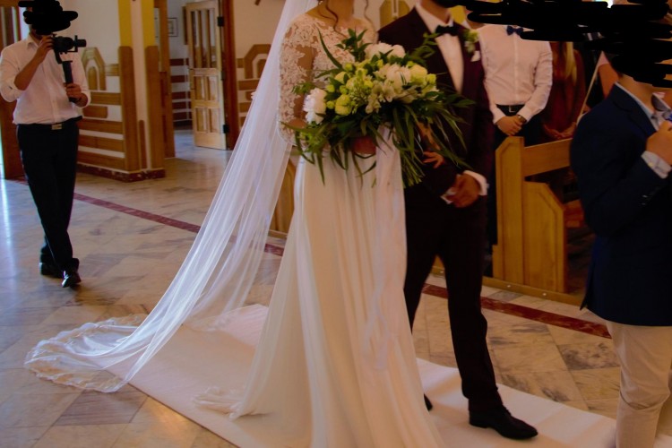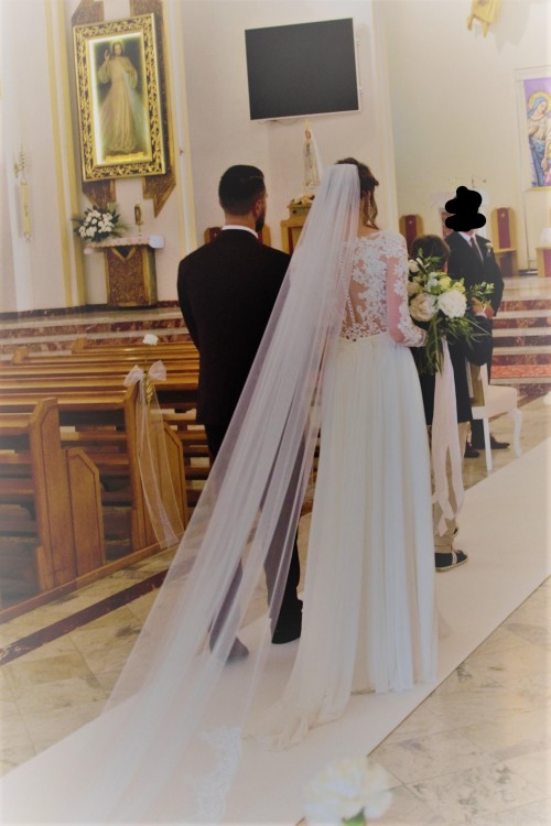 Witam mam do sprzedania suknie z salonu . Suknia jest uszyta z wysokiej jakości materiału, dół muślinowy góra koronkowa zapinana z tyłu na guziczki. Jestem pierwszą właścicielką sukni. Suknia dopasowana do wzrostu 178 plus 5 cm obcas, rozmiar 38. Polecam szczególnie dla Pań które cenią sobie wygodę i swobodę :) Suknia nie krępuje ruchów podczas tańca, mimo długiego rękawa. Posiada cieniutki pasek oddzielający koronkę od dolnej części sukienki który pięknie podkreśla talię. Na koronce naszyte są malutkie koraliki które nadają tej sukni niesamowitego blasku. Dodatkowo posiada ona tren dopinany na zatrzaski, który mimo braku welonu może tworzyć piękne przedłużenie sukni podczas wejścia do kościoła. CENA DO NEGOCJACJI.