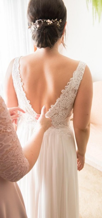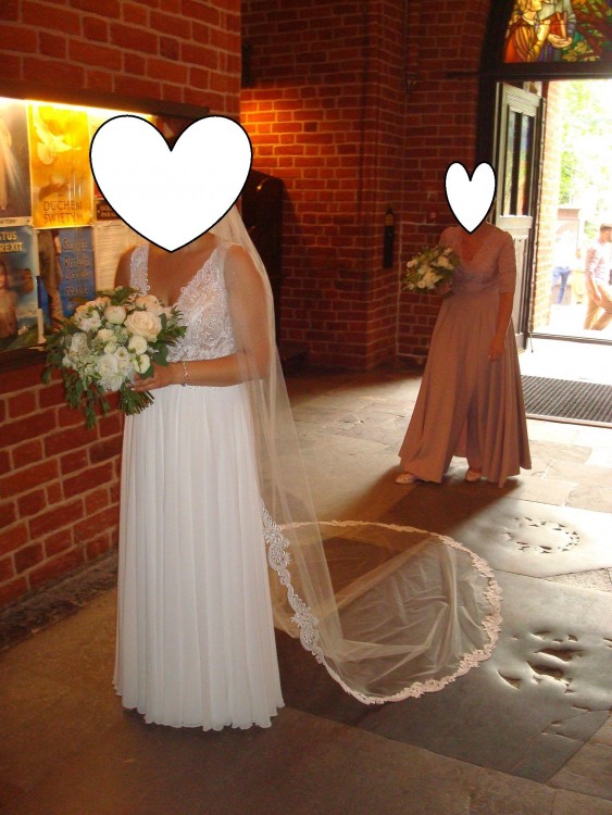 Góra sukni obszyta piękną koronką, dekolt z przodu i z tyłu w kształcie "V" z zapięciem na dole. Suknia posiada rozcięcie, ma wszyte miseczki. Posiada jedno malutkie zaciągnięcie na warstwie muślinu, zupełnie niewidoczne. Suknia została wyprana w profesjonalnej pralni.
