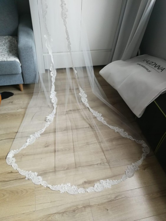 Cena sukni w salonie to 4290 zł (posiadam paragon). Do sukni dołączam oryginalny pokrowiec oraz długi katedralny welon 3m zakończony tą samą koronką, kolor ivory. Możliwość zakupu oddzielnie, koszt samego welonu to 300 zł. Możliwość przymiarki w Olsztynie.