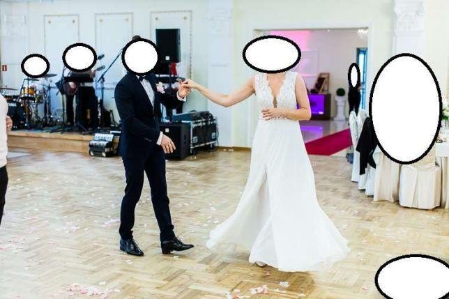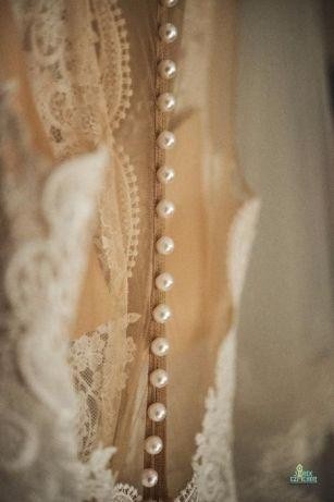 Góra sukni została wykonana z nietuzinkowej koronki naszytej na cielistą, niewidoczną siateczkę, co daje zjawiskowy efekt. Wewnątrz wszyte są miseczki podtrzymujące biust.