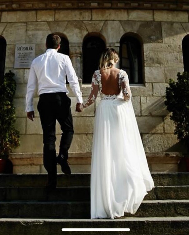 Suknia zakupiona w salonie Madonna w Krakowie. Starannie wykończona delikatną koronką i drobnymi perełkami. Lejący się, muślinowy dół (2 warstwy muślinu + jedwabna podszewka) wyeksponowane plecy i podkreślona talia oraz dbałość o najmniejszy detal sprawią, ze będziesz lśnić! Kolor sukni to łamana biel, koronka na delikatnej, ledwo widocznej siateczce (możliwość dołożenia koronki w salonie Madonna, zmiany miseczek, drobnych poprawek krawieckich).