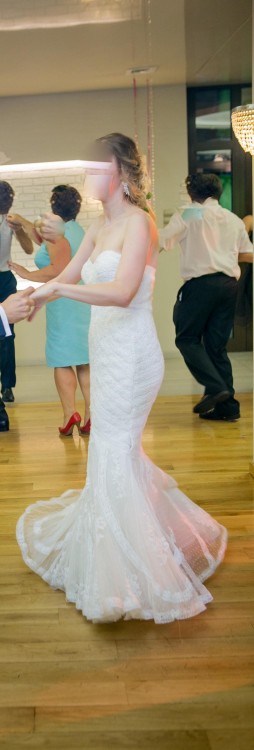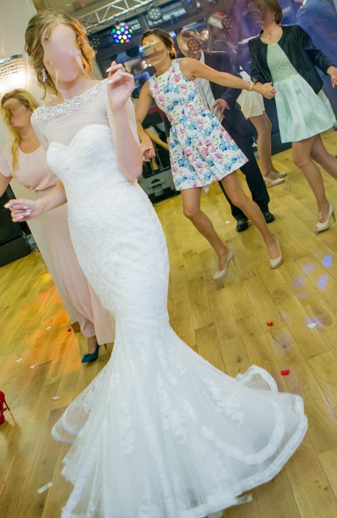 Dzień przed weselem obcięty został tren (widoczny na zdjęciu z katalogu) ponieważ nie chciało mi się z nim walczyć podczas ślubu ;) uważam,że był to świetny pomysł wspominając tańce i różne dzikie węże podczas wesela, tylko by mi przeszkadzał. Suknie można śmiało zwęzić i poszerzyć jest w niej dużo zapasu ponieważ byłam w niedługim czasie po porodzie wiec nie wiedziałam do końca jakie będą moje ostateczne wymiary. Bardzo proszę o kontakt mailowy amandakozakiewicz@wp.pl odpowiem na wszystkie pytania.