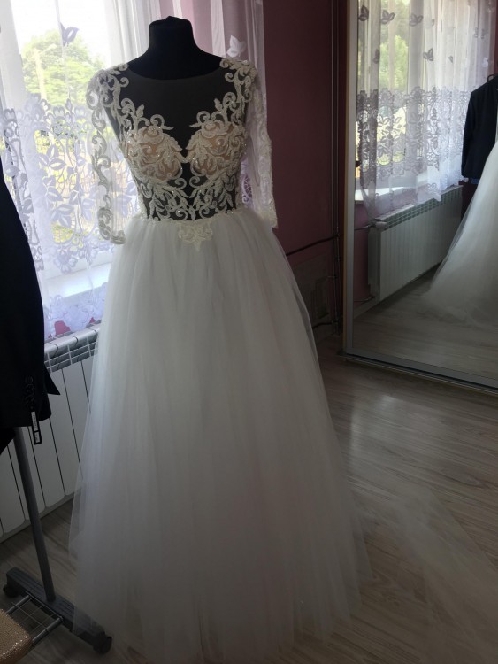 Rękaw 3/4 z możliwością obcięcia na krótszy.Z tylu sukienki koronka, zapinana na ozdobne guziczki. Niewidoczna siateczka.
