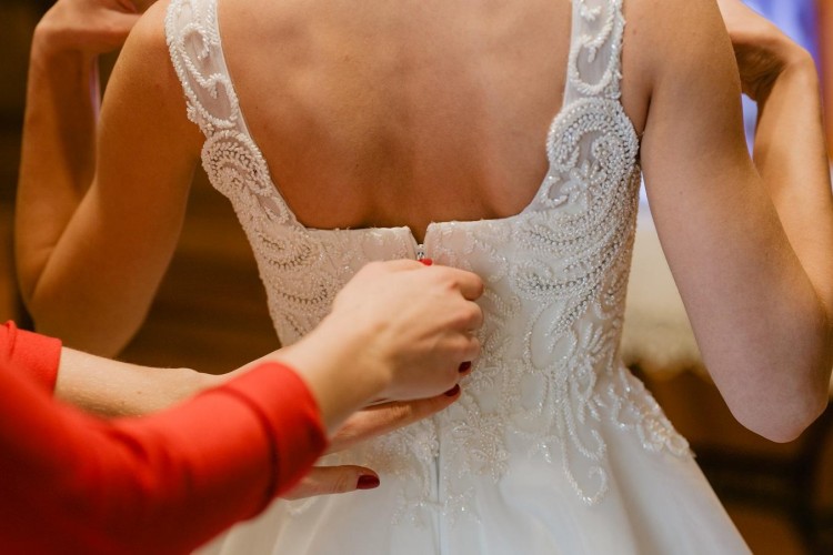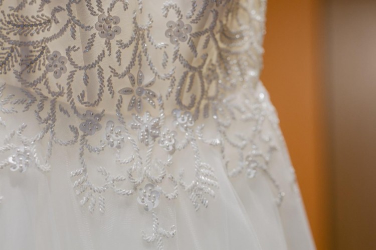 Suknia zapinana z tyłu na zameczek. Gorset wyszywany ręcznie pięknie mieniącymi się koralikami. Dół sukni wykonany z delikatnego, zwiewnego tiulu. Sukienka delikatnie dłuższa z tyłu dzięki czemu przepięknie układa się podczas poruszania się.