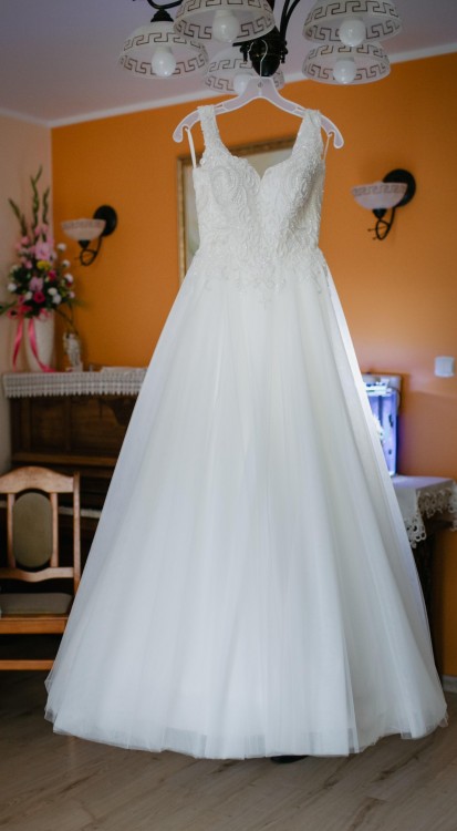 Rozmiar sukni 32/34. Kolor Ivory. Długość dopasowana do wzrostu 168 w szpilkach 8 cm.