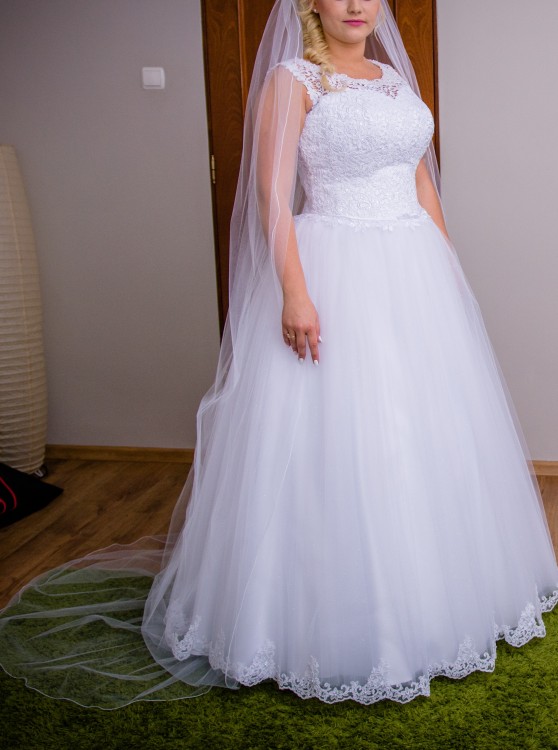 Gratis daje dwa welony, jeden krótki, drugi długi katedralny. Posiadam również biżuterię, która również mogę załączyć do sukni.
