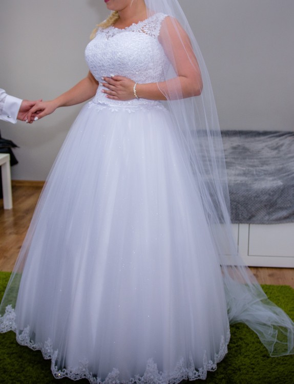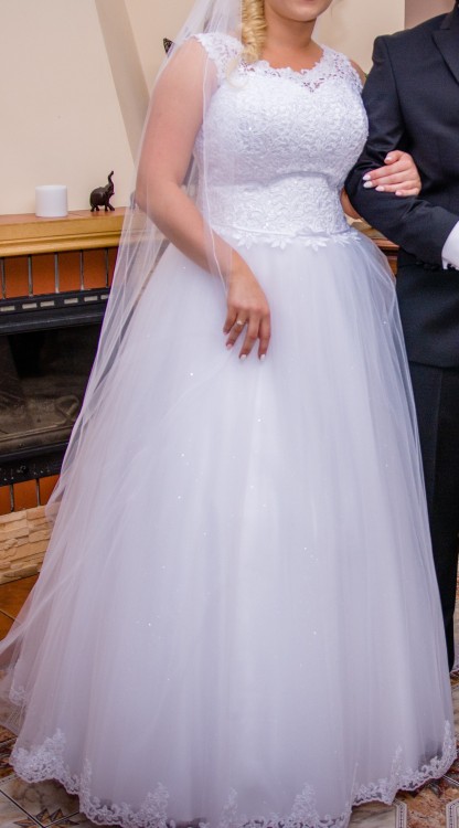 Witam, na sprzedaż suknia ślubna Magdalena w rozmiarze ok. 40-42 na duży biust, ale bez problemu wejdą również większe Panny Młode że względu na kryte sznurowanie pod guziczkami :) możliwość również zwężenia sukni. Góra jest gorsetowana i wyszyta gipiurą, dół zaś jest tiulowy na małym kole, pod pierwsza warstwa tiulu znajduje się warstwa brokatowa która nadaje sukni niepowtarzalny blask. Suknia szyta na wzrost 170cm przy 7,5cm obcasie, ale bez problemu można ją skrócić.