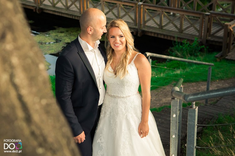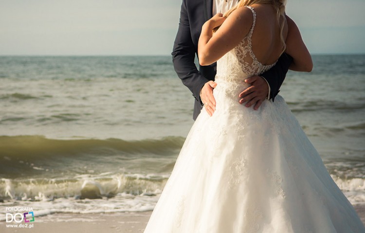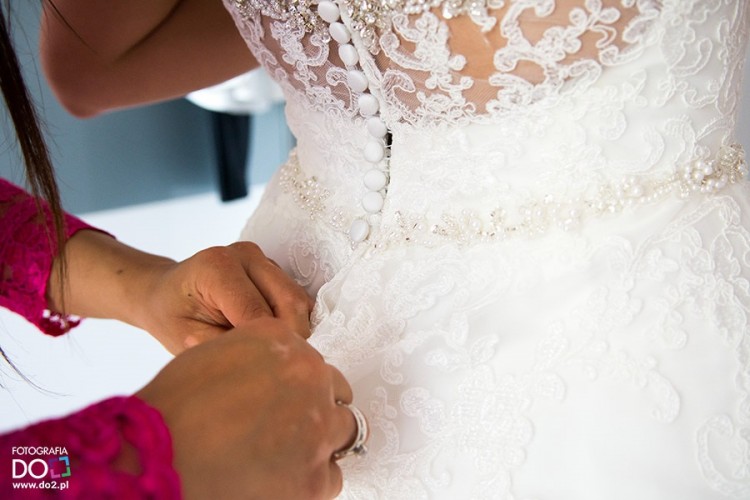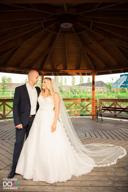Suknia z długim trenem, który na czas wesela można podpiąć.