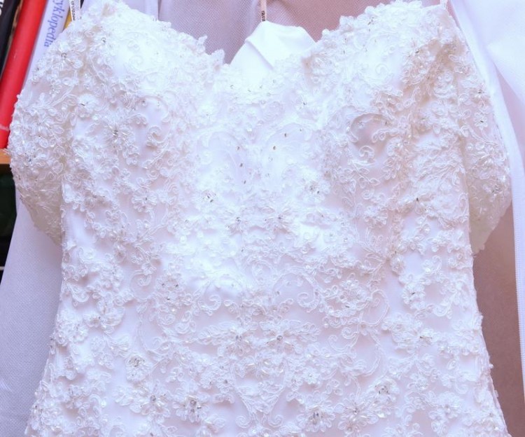 Suknia posiada dopinane naramki oraz gorset, dzięki któremu można dowolnie regulować szerokość sukni.
