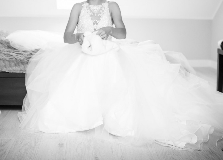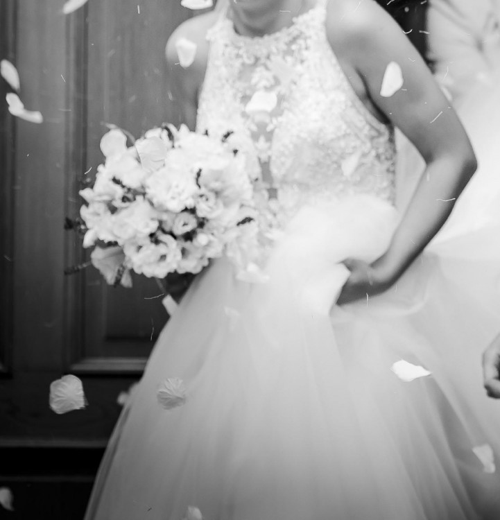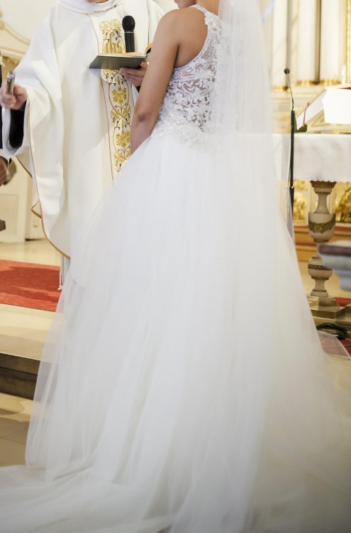 Suknia szyta była w Stanach Zjednoczonych w kolorze ivory, jest lekka z przyjemnością spędziłam w niej całą noc, z tyłu posiada tren który można podczepić do sukni dodaje welon długi oraz halkę tzw.koło pod suknie jest bardzo smukłe i delikatne. Które miało za zadanie swobodne ruchy podczas tańczenia.