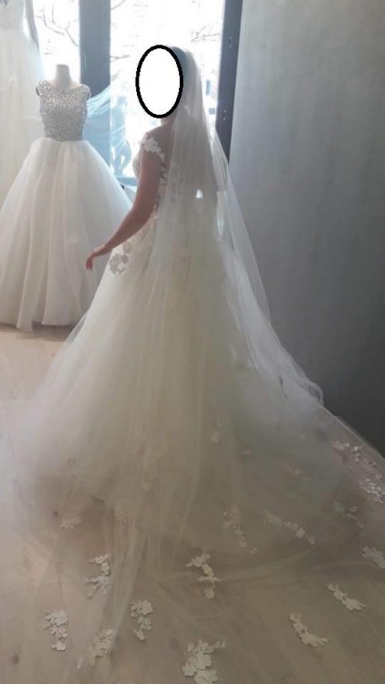 Sprzedam piękną suknię ślubną marki Maggio Ramatti z kolekcji 2018/2019. Kolor ecru. Góra koronkowa z błyszczącymi aplikacjami, z lekko opadającymi ramiączkami, a całość na górze podtrzymuje cielista siateczka. Delikatnie odkryte plecy z guziczkami na całej długości. Tiulowy dół z delikatnymi koronkowymi aplikacjami na górze spódnicy, bardzo ładnie układający się w tańcu. Do sukni dołączona halka na kole plus długi welon z koronkowymi aplikacjami (można też kupić bez welonu) Szyta na wzrost 163 cm, rozmiar 36, wszyte miseczki C. Suknia po czyszczeniu.