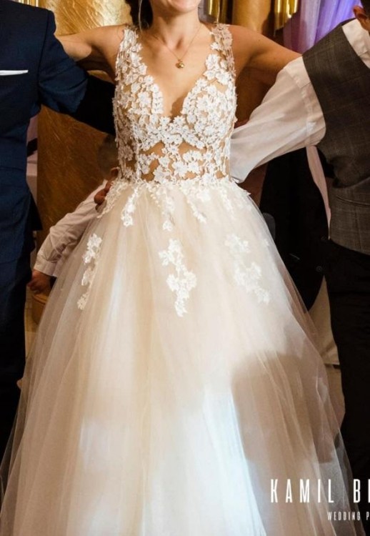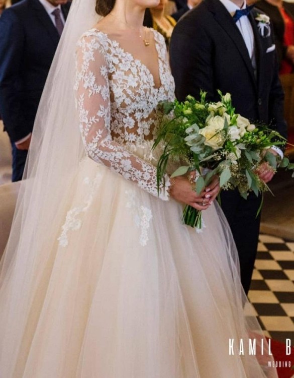Sprzedam suknię ślubną Maggio Ramatti model Kasey,suknia była szyta na wzrost 168 cm + 5cm obcas. (rozmiar 36/małe 38). Kolor sukni cielisty/szampański (wg opisu salonowego).