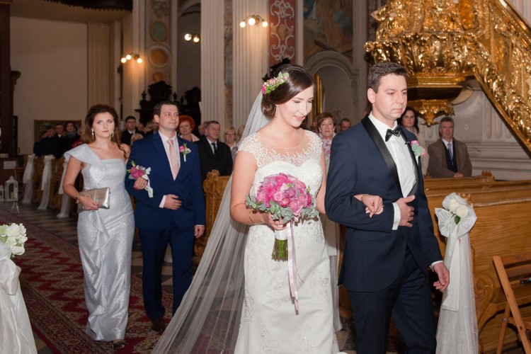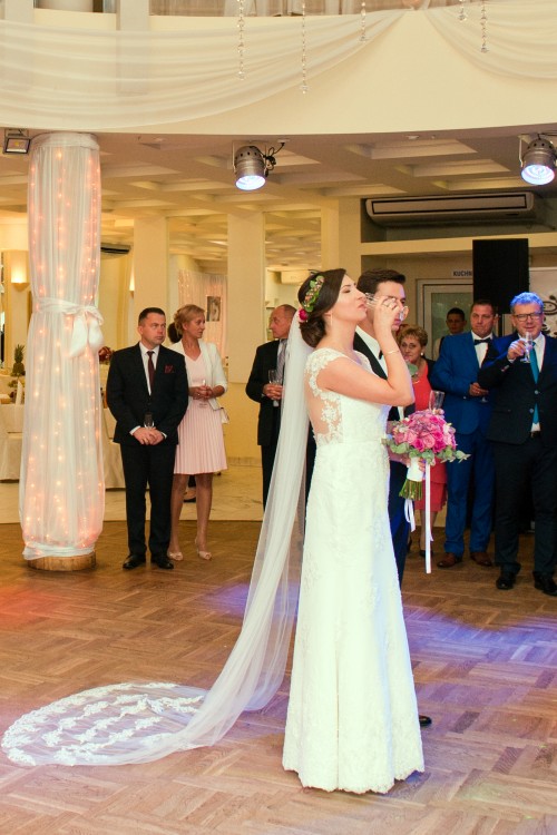 Bez koła i trenu. Z długim, delikatnym welonem zrobiła duże wrażenie na gosciach.