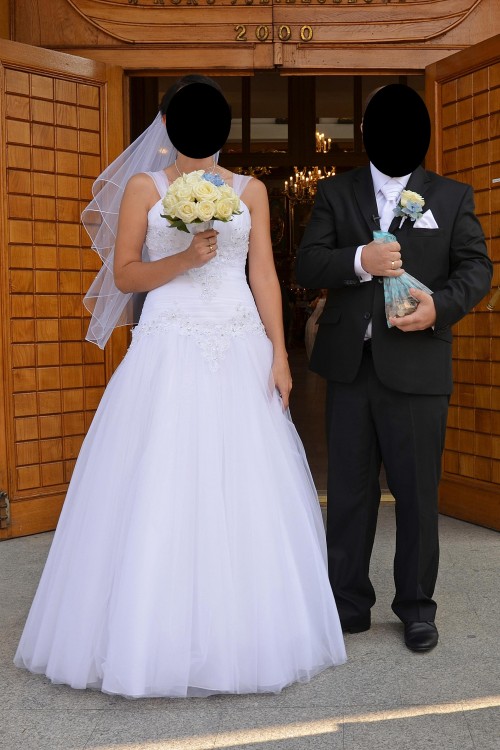Sprzedam białą suknię ślubna w której dół wykonany jest z kilku wartw tiulu a góra zdobiona jest kryształkami Swarovskiego. .Powinna pasować na rozmiar 36/38 na wzrost 165cm+5cm obcas (jest wiązana z tyłu więc można ją regulować). Posiada również odpinane tiulowe ramiączka. Bardzo ładnie się układa i jest wygodna. Suknia jest po czyszczeniu chemicznym. Stan sukni określam jako bardzo dobry.