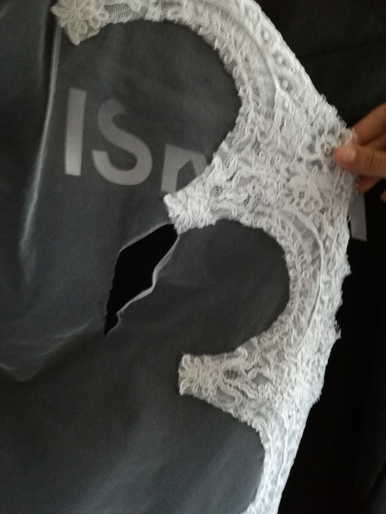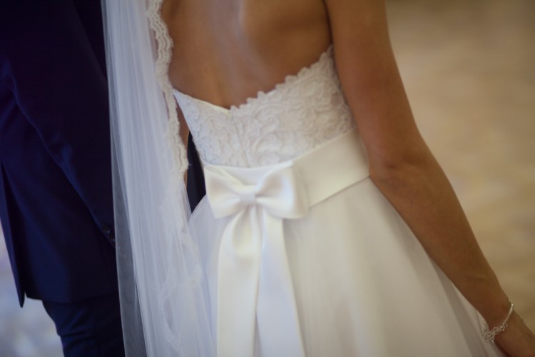 Piękny detal w postaci kokardki z tyłu doczepianej na pasie po zdjęciu trenu (przepięknie prezentujący się podczas ceremonii kościelnej. (dziura widoczna na zdjęciu))