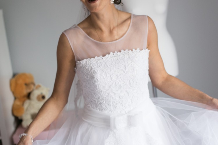 Suknia w dwóch odsłonach (tren, bolerko, welon) z salonu Margaret