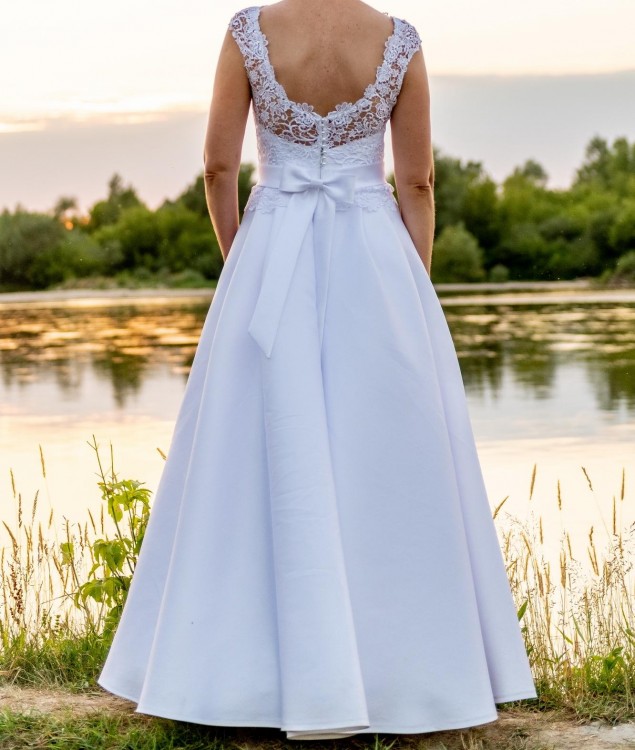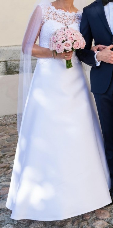 Witam. Do sprzedania mam piękną elegancką suknie ślubną z kolekcji Margarett Eviva 2018 (bez trenu). Suknia w stanie idealnym, w kolorze białym, rozmiar 36/38 zakupiona w salonie mody Margarett , pasuje na wzrost 175cm (do płaskich butów). Do sukni dodaje halkę na kole oraz welon (3m)- gratis. Serdecznie polecam suknia pięknie się układa, jest bardzo wygodna i lekka, dół wykonany z materiału mikado, góra z przepięknej gipiury. Polecam.