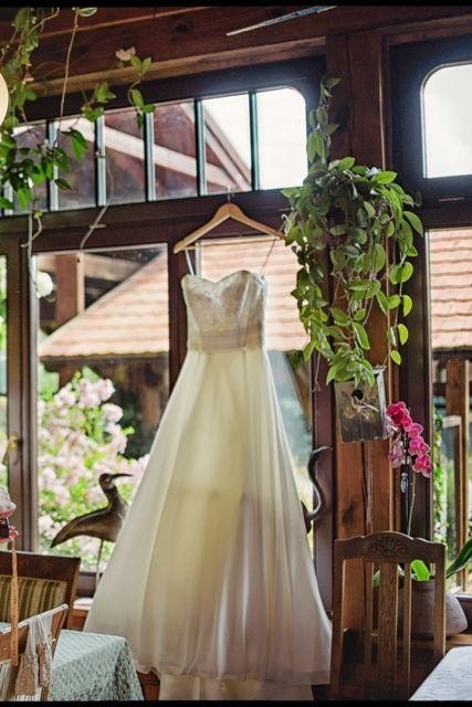 Suknia jest lekka i romantyczna, dol wykonany z muślinu. Posiada podpinany tren, który pięknie komponuje się na zdjęciach.
