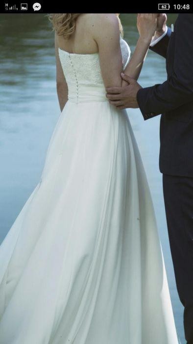 Witam serdecznie. Oferuję na sprzedaż suknię ślubną Margarett w rozmiarze 36/38 w kolorze ivory. Suknia jest lekka i romantyczna, dol wykonany z muślinu. Posiada podpinany tren, który pięknie komponuje się na zdjęciach. Suknia ubrana dwa razy, na ślub i na sesję. Szyta w salonie ślubnym Gracja w Poznaniu na wymiary (szacunkowo)