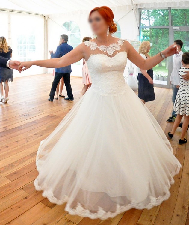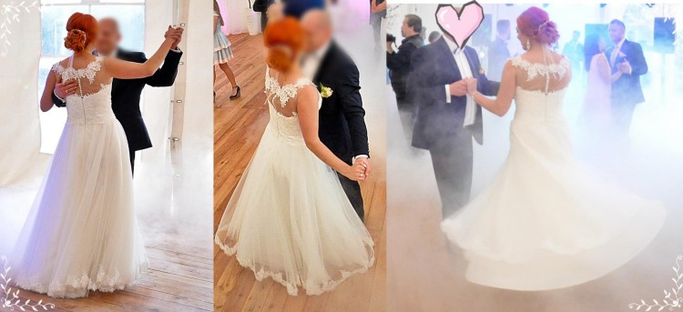 Suknia ma lekko wydłużony stan oraz zmniejszoną objętość (uszyta bez jednej warstwy tiulu). Uszyta z pełnego koła z małymi marszczeniami dzięki czemu bardzo ładnie układała się podczas tańca. Cały dół ozdobiony koronką (taką samą jak na całej sukni).