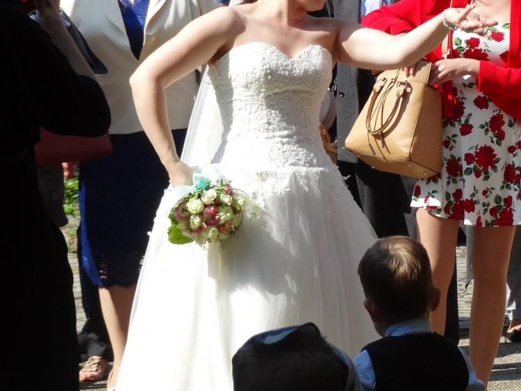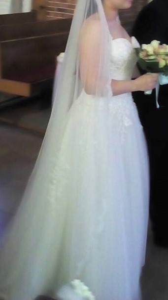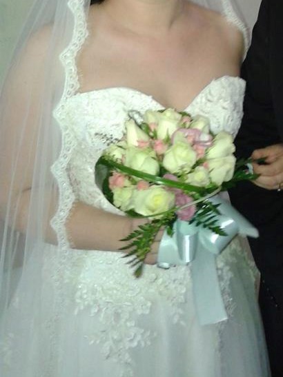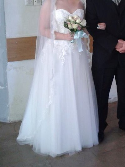 Suknia była założona w dniu ślubu oraz na sesję zdjęciową, jest po profesjonalnym czyszczeniu. Suknia szyta na wzrost 160cm + 10cm obcas. Rozmiar 38, jednak dzięki wiązanemu gorsetowi istnieje możliwość dopasowania.