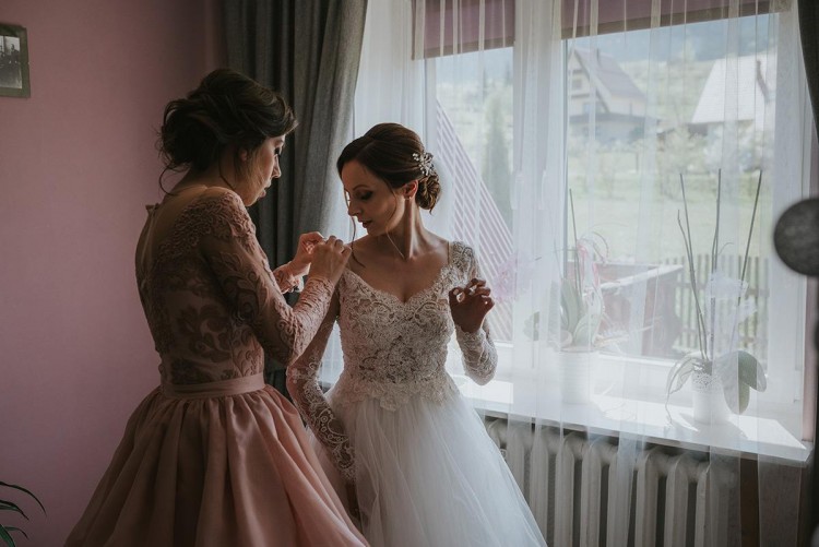 Jest to model Maureen z indywidualnymi modyfikacjami - ma doczepiane piękne długie koronkowe rękawy (rękawy są mobilne i można je odpiąć) oraz dopinany tren, który w kościele wyglądał bardzo efektownie.