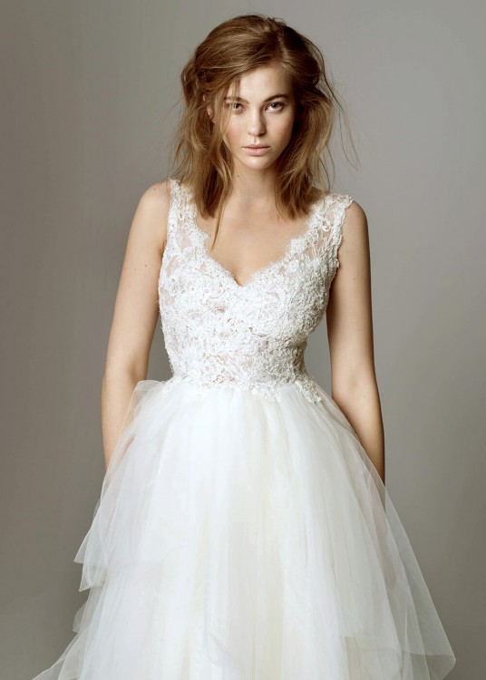 Ma długi tren, który można doszyć i odciąć w ułamku sekundy. Na zdjęciach widać suknię z trenem i bez.