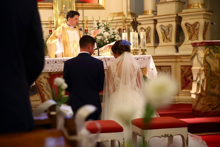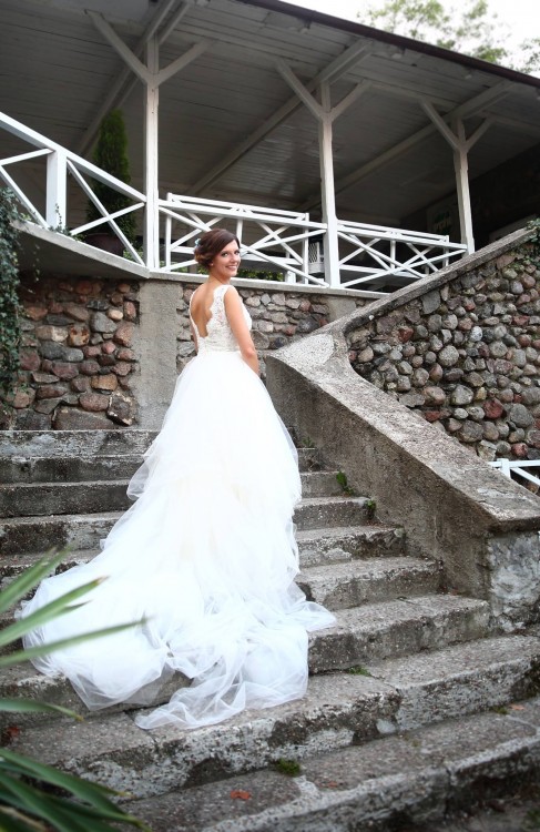 Suknię można przymierzyć w Pruszkowie pod Warszawą albo w Serocku. Do sukni dołączam oryginalny długi welon, który w kościele idealnie posłużył za osłonę gołych ramion i pleców.